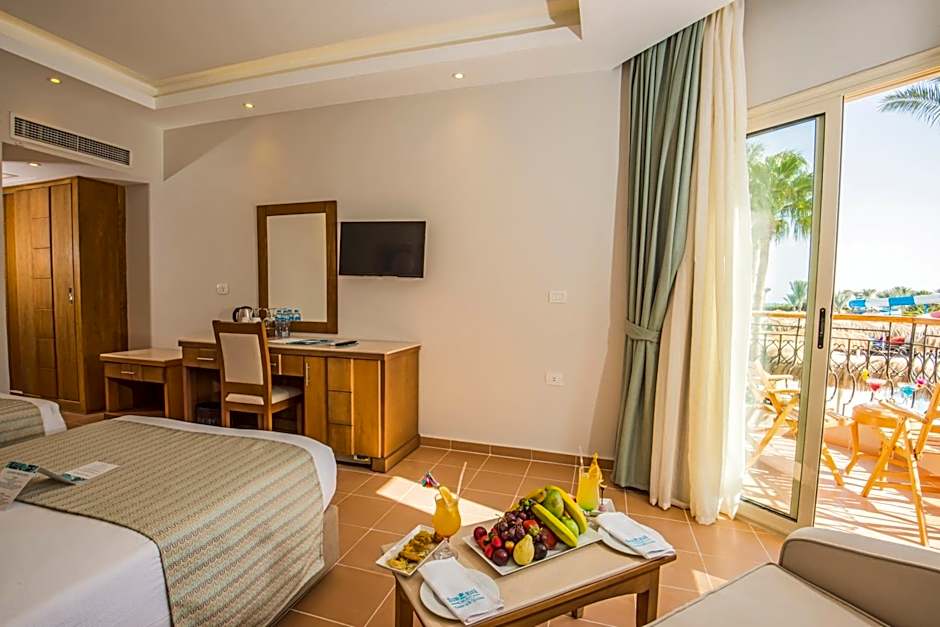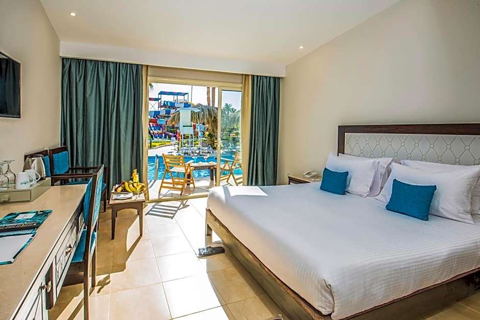This room features a bedroom with a king size bed or twin beds, a fold-able sofa bed, a seating area, a bathroom with a shower and a terrace or balcony with pool views. The room also offers free WiFi, a satellite LED TV, a safe box, tea and coffee facilities and a mini-bar.